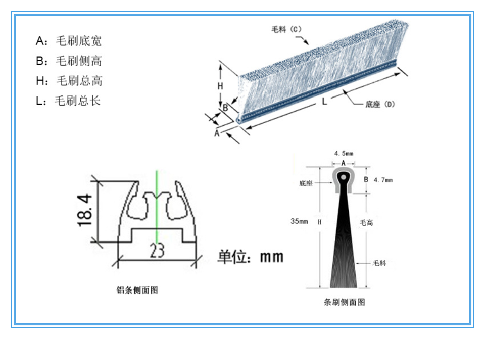 我司電梯毛刷根據(jù)國(guó)家標(biāo)準(zhǔn)要求,分為單排和雙排兩種規(guī)格,鋁合金底座經(jīng)過(guò)氧化處理,表面光滑,耐磨損。毛刷材質(zhì)柔軟,耐磨性高。產(chǎn)品規(guī)格均適用于日立、迅達(dá)、蒂森克虜伯、西子奧的斯、三菱、通力等電梯品牌。
